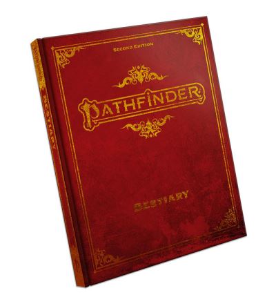 - More than 400 of fantasy's fiercest foes burst from the pages of this enormous 360-page compendium of the most popular and commonly encountered creatures in the world of Pathfinder! From familiar enemies like orcs, dragons, and vampires to new horrors like the living-nightmare nilith and the three-headed mutoli, to suitable servants for summoners of every alignment, this must-have companion to the Pathfinder Core Rulebook is crawling with creatures perfect for your Pathfinder adventures! This deluxe special edition is bound in faux leather with metallic deboss cover elements and a bound-in ribbon bookmark. The perfect way to commemorate Pathfinder's new edition! (Cover color and design subject to change.) The Pathfinder Bestiary includes: More than 400 monsters drawn from mythology, genre classics, and more than a decade of Pathfinder, with plenty of new monsters too! Gorgeous full-color illustrations on nearly every page! Detailed monster lists sorted by level, type, and rarity to help you find the right monster for any situation! Universal monster rules to simplify special attacks, defenses, and qualities like grab, swallow whole, and regeneration. Guidelines for providing appropriate monstrous treasures for any occasion. Detailed lore sidebars offering additional information about Pathfinder's most popular monstrous friends and foes!