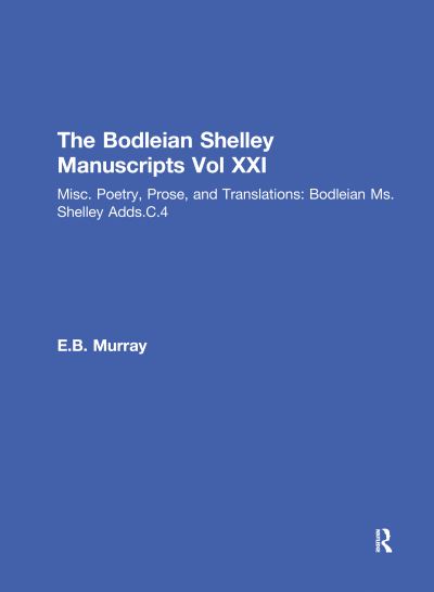 - First published in 1996. This is noted as Volume XXI of the Bodleian Shelley Manuscripts and includes copies of 'Misery- a fragment', 'Ode to Naples', 'Una Favola' and drafts of 'The Coliseum', 'On Vegetarianism', along with translation of 'Goethe's Faust' and more. This volume also includes scholarly opinion from a knowledgable students of Shelley's manuscripts, Professor E.B. Murray, the editor of the magnificent first volume of the Clarendon Press edition of The Prose Works of Percy Bysshe Shelley (1993),as well as Volume IV in The Bodleian Shelley Manuscripts.