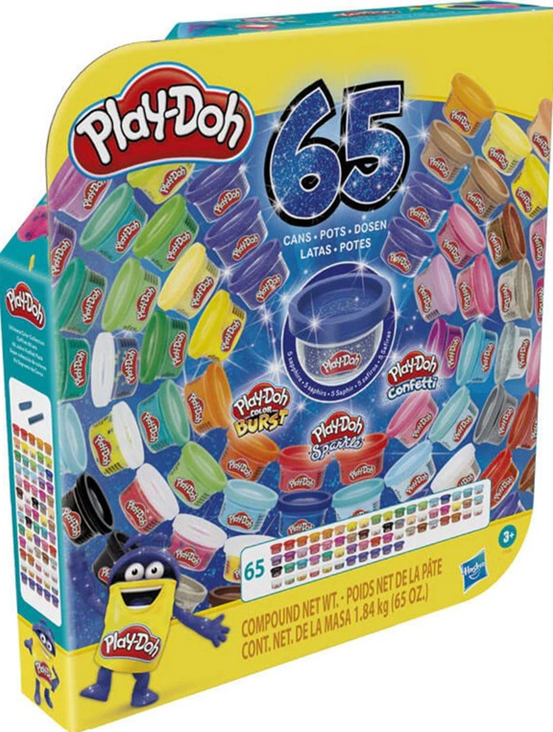 The Play-Doh 65-pack is perfect for kids to share, and it comes with a wide variety of 60 colours. These small 1-ounce Play-Doh cans feature 5 cans of sparkly blue Play-Doh Sapphire compound plus 32 classic colours, 7 Play-Doh Confetti colours, 13 Play-Doh Sparkle colours, and 8 Colour Burst mixing colours. This fun size Play-Doh set has plenty of modelling compound for party favours, goodie bag fillers, arts and crafts activities, or a great gift for kids 3 and up who love to get creative with modelling clay!