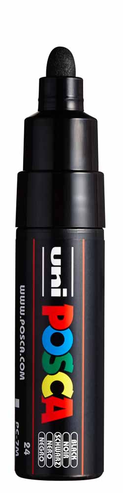 These markers have a large bullet shaped fibre tip making them ideal for filling in background colours or working on large scale art like wall murals or urban art. Posca writes on virtually any surface; metal, wood, canvas, plastic, fabric, etc, and will not ‘bleed through’ paper. POSCA markers use water-based pigment ink to produce poster-paint-like vibrant colours. Posca is easily removed from glass, making it ideal for temporary signs and window art. Once dry, you can easily layer over the top to build your design and correct any errors. Alcohol and solvent free. Bullet tip 4.5-5.5mm