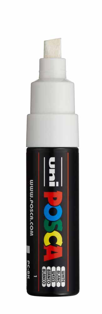 These markers have a large chisel shaped fibre tip making them ideal for filling in background colours or working on large scale art like wall murals or urban art. Posca writes on virtually any surface; metal, wood, canvas, plastic, fabric, etc, and will not ‘bleed through’ paper. POSCA markers use water-based pigment ink to produce poster-paint-like vibrant colours. Posca is easily removed from glass, making it ideal for temporary signs and window art. Once dry, you can easily layer over the top to build your design and correct any errors. Alcohol and solvent solvent free. Chisel tip 8.0mm.