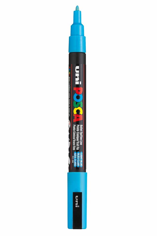 These markers have a versatile fine fibre tip making them ideal for all types of art. Posca writes on virtually any surface; metal, wood, canvas, plastic, fabric, etc, and will not ‘bleed through’ paper. POSCA markers use water-based pigment ink to produce poster-paint-like vibrant colours. Posca is easily removed from glass, making it ideal for temporary signs and window art. Once dry, you can easily layer over the top to build your design and correct any errors. Alcohol and solvent free. PC-3M nib size 0.9 -1.3mm bullet tip