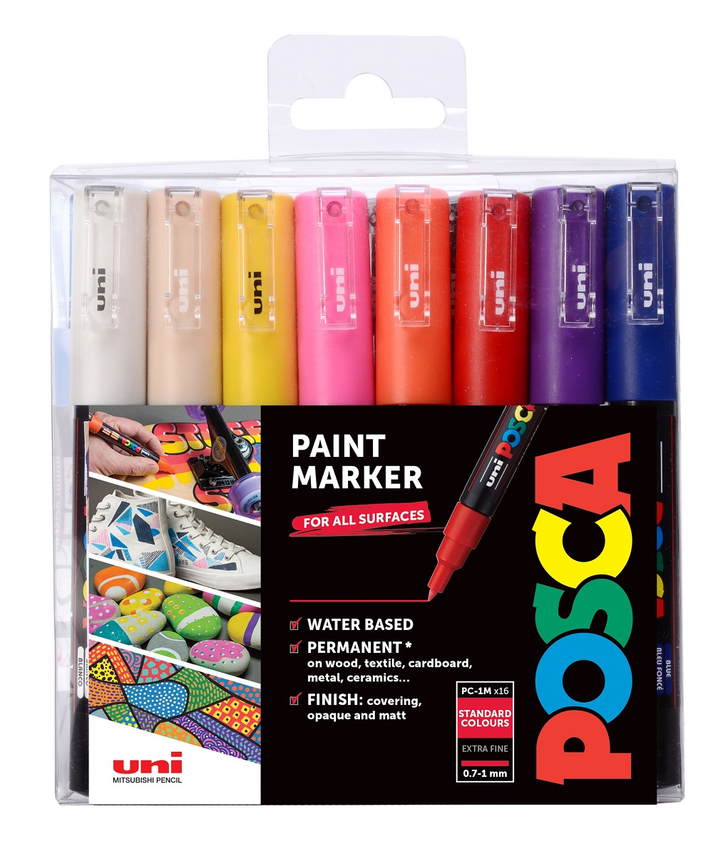 These markers have an extra-fine fibre tip making them ideal for card making and anything that involves intricate detail. Posca writes on virtually any surface; metal, wood, canvas, plastic, fabric, etc, and will not ‘bleed through’ paper. POSCA markers use water-based pigment ink to produce poster-paint-like vibrant colours. Posca is easily removed from glass, making it ideal for temporary signs and window art. Once dry, you can easily layer over the top to build your design and correct any errors. Alcohol and solvent free. PC-1M has a .7mm bullet tip