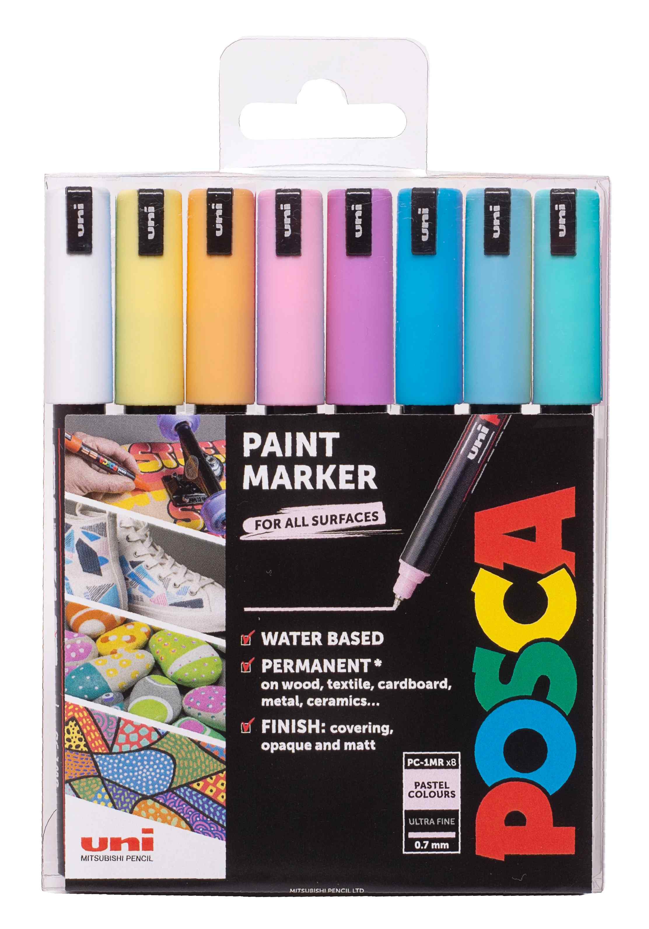 Pack of 8 trendy pastel colours. These markers have an extra-fine fiber tip making them ideal for card making and anything that involves intricate detail. Posca writes on virtually any surface; metal, wood, canvas, plastic, fabric, etc, and will not ‘bleed through’ paper. POSCA markers use water-based pigment ink to produce poster-paint-like vibrant colours. Posca is easily removed from glass, making it ideal for temporary signs and window art. Once dry, you can easily layer over the top to build your design and correct any errors. Alcohol free, solvent free.colours: White,Light pink, Sky blue, Coral pink , Aqua green, Sunshine yellow, Apricot ,Lavender