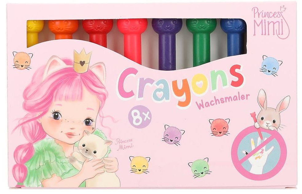 Great colouring fun for little artists: The Princess Mimi wax crayons in 8 different colours have a cute cat's head at the end that peeks out of the top of the hand when colouring. The pens do not stain the hands!