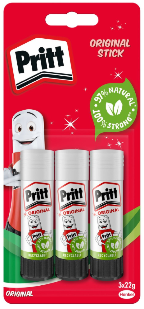 Since 1969, Pritt Stick is the ideal clean, quick and accurate way of sticking paper, cardboard and photos. Pritt is the world market leader and the originator of the glue stick. Pritt stick is made from 97% of natural ingredients (water included), thanks to a combination of potato starch, sugar and water.
