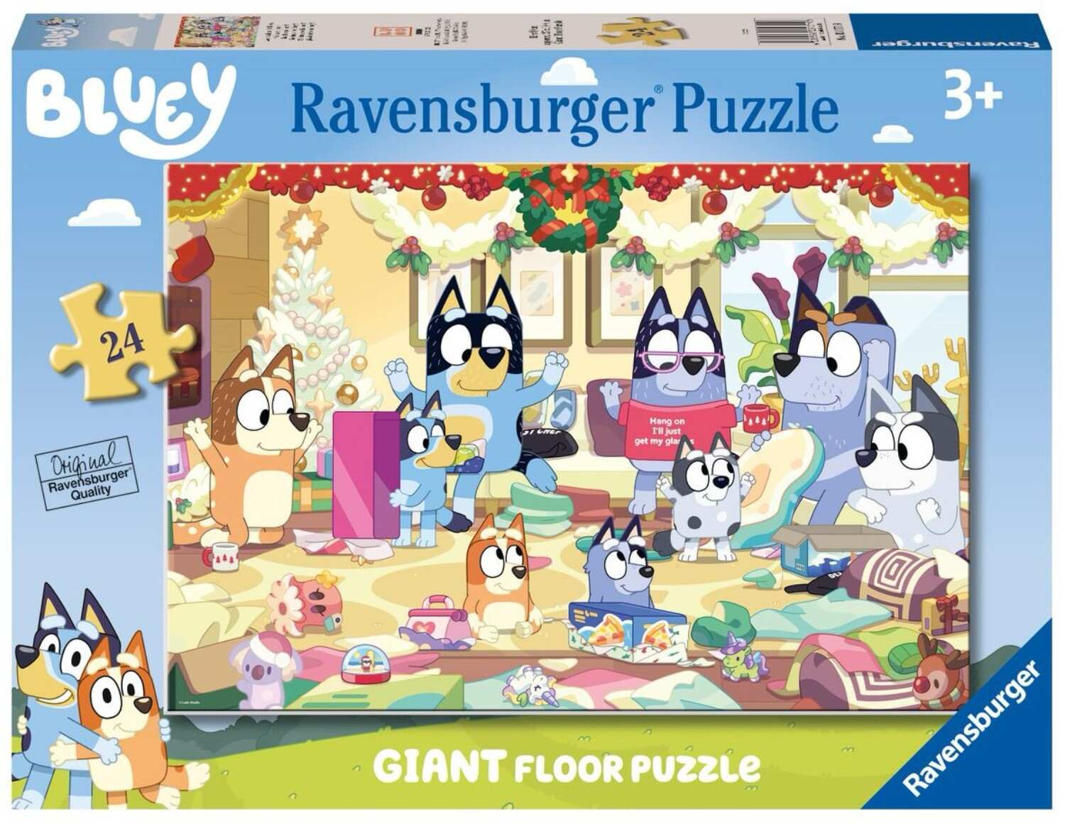- Get into the festive spirit with Bluey, Bingo, Chilli, Bandit, Nana, Uncle Stripe, Aunt Trixie, Muffin and Socks as they gather round to exchange gifts on Christmas Morning. They can hardly contain their excitement! This festive 24 piece giant floor puzzle is a great addition to any child's growing Bluey collection. Our 24 piece my first floor kids puzzle are crafted with premium quality materials and measure 70 x 50cm when complete. Great puzzles for Children 3 years old and up. Fully complies with all necessary UK and EU testing standards. Bestselling puzzle brand worldwide - With over 1 billion puzzles sold, our children's jigsaw puzzles make ideal gifts for boys and great gifts for girls. Our puzzles use an exclusive, extra-thick cardboard combined with our fine, linen structured paper to create a glare-free puzzle image and give you the best experience possible. #Positivelypuzzling - From fun family times together to long term health benefits and day-to-day mindful moments, there are so many positives about the humble Jigsaw! They make a great birthday gift or smashing Christmas gift.Warning! Not suitable for children under 36 months due to small parts which pose a choking hazard