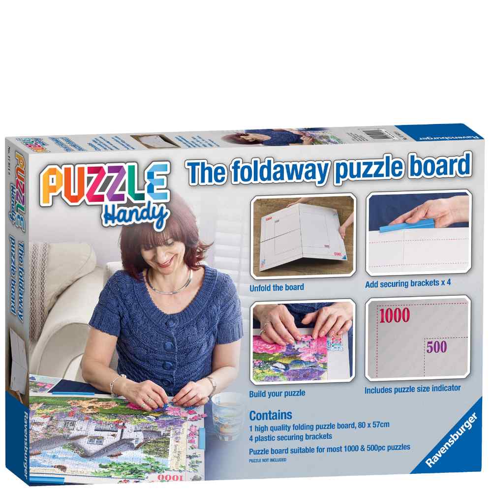 Puzzle Handy is a foldaway puzzle board, suitable for assembling 1000 piece and 500 piece jigsaw puzzles. The Puzzle Handy unfolds to measure 80 x 57cm. Assembly is simple: just unfold the board, and add plastic securing brackets on each side to make the board rigid and begin puzzling away! Puzzle Handy is printed on a neutral non-glare background colour, and includes dotted guidelines showing the finished sizes of Ravensburger's 500 and 1000 piece puzzles. It is also manufactured from FSC approved materials! Use the guidelines to help you ensure your puzzle is centrally located on the board, which can be a great help with the jigsaw building process. When you've finished your puzzle and want to put the Puzzle Handy away, just remove the securing brackets, refold the board and pop it back into the storage box provided! Contains 1 high quality folding puzzle board, measuring 80 x 57cm and 4 plastic securing brackets contained within a high quality storage box. Box base includes full instructions. Part of Ravensburger’s range of puzzle accessories.