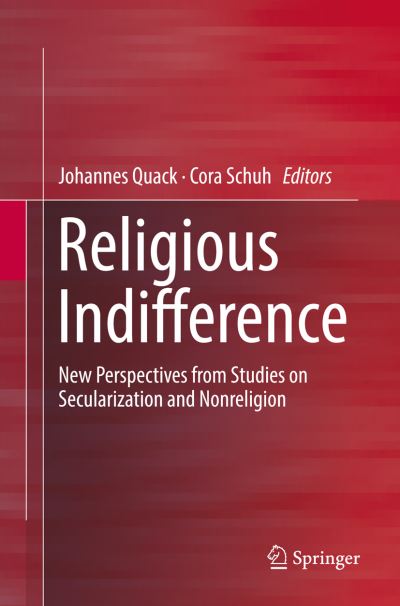 - This book provides a conceptually and empirically rich introduction to religious indifference on the basis of original anthropological, historical and sociological research. Religious indifference is a central category for understanding contemporary societies, and a controversial one. For some scholars, a growing religious indifference indicates a dramatic decline in religiosity and epitomizes the endpoint of secularization processes. Others view it as an indicator of moral apathy and philosophical nihilism, whilst yet others see it as paving the way for new forms of political tolerance and solidarity. This volume describes and analyses the symbolic power of religious indifference and the conceptual contestations surrounding it. Detailed case studies cover anthropological and qualitative data from the UK, Germany, Estonia, the USA, Canada, and India analyse large quantitative data sets, and provide philosophical-literary inquiries into the phenomenon. They highlight how, for different actors and agendas, religious indifference can constitute an objective or a challenge. Pursuing a relational approach to non-religion, the book conceptualizes religious indifference in its interrelatedness with religion as well as more avowed forms of non-religion.