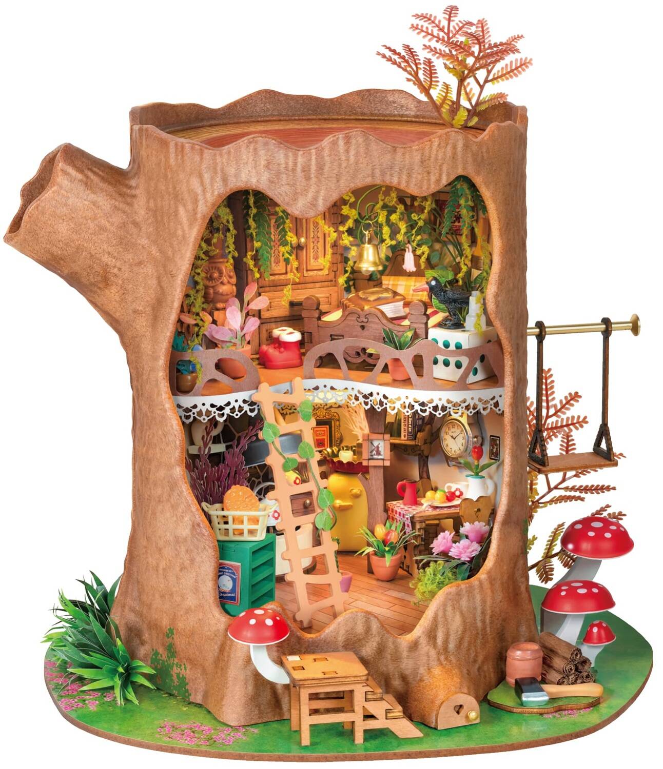 Nestled deep within the forest is a tiny tree house tucked inside a hollow tree trunk. Tiny woodland creatures live here, using people’s lost or discarded items as fixtures and furnishings. A strapless watch becomes a wall clock, a pair of dice serve as small tables, and a funnel transforms into a stove hood. Thanks to the woodland residents’ ingenuity, this simple two-story home has everything: wooden furniture, a snug bedroom, a kitchen, a dining area, appliances, wall décor, potted plants, a mushroom garden, and even a swing. What more could you need when nature is your neighbor and cuteness your companion? Come, build and tell the story of this cozy forest residence, then switch on the LED lights to turn your project into a delightful display.<P>Enter a magical forest where tiny creatures live inside a sturdy tree trunk. Nature is their playground, and forgotten trinkets have become home furnishings.