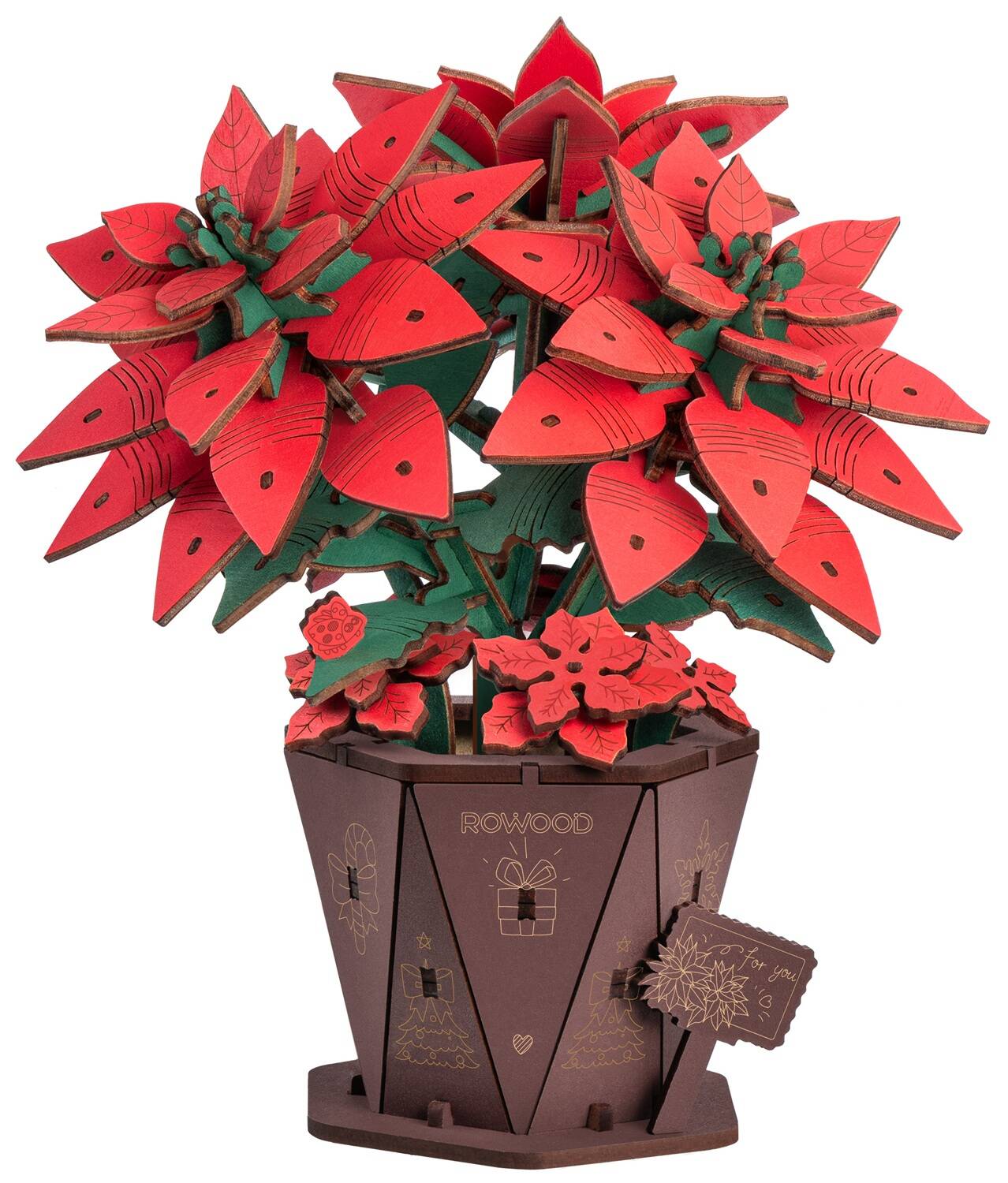 Wooden Poinsettia Model Kit: Assemble a beautifully crafted wooden poinsettia flower with precisely cut pieces that fit smoothly. Easy 1-hour assembly with no glue or tools required, making it a relaxing hands-on project that adds natural wooden elegance to desks, living rooms, or offices