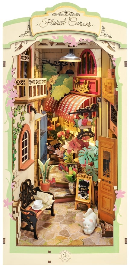 ROBOTIME Floral Street Design: Recreate a picturesque European street corner with rich floral decorations and iconic architecture. The intricate details, from the elegant ivy and ribbon-adorned doorways to the colorful flower stalls, evoke the romance and charm of European aesthetics.