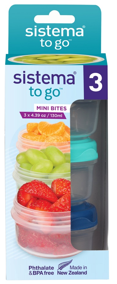 The Sistema® To Go™ range is perfect for busy lifestyles. Convenient products designed for keeping salads, sandwiches and other food items fresh on the go, with multi compartments to keep ingredients separated until you are ready to eat. Whether you are taking lunch to the work place, to school or on trips to the park, we have everything covered for your food on the go needs with lunch boxes, snack pots, bowls and cutlery. The Sistema® Mini Bites To Go™ is perfect for taking your yogurt, snacks, fruit and more on the go. Simply place your snacks into the base and twist on the seal-tight screw top lids to close. The Sistema® Mini Bites To Go™ features stackable, seal-tight, screw top lids to keep your snacks fresh until ready to eat. This product is stackable and safe to use in the dishwasher (on the top rack), the microwave (without the lid), or in the fridge and freezer.