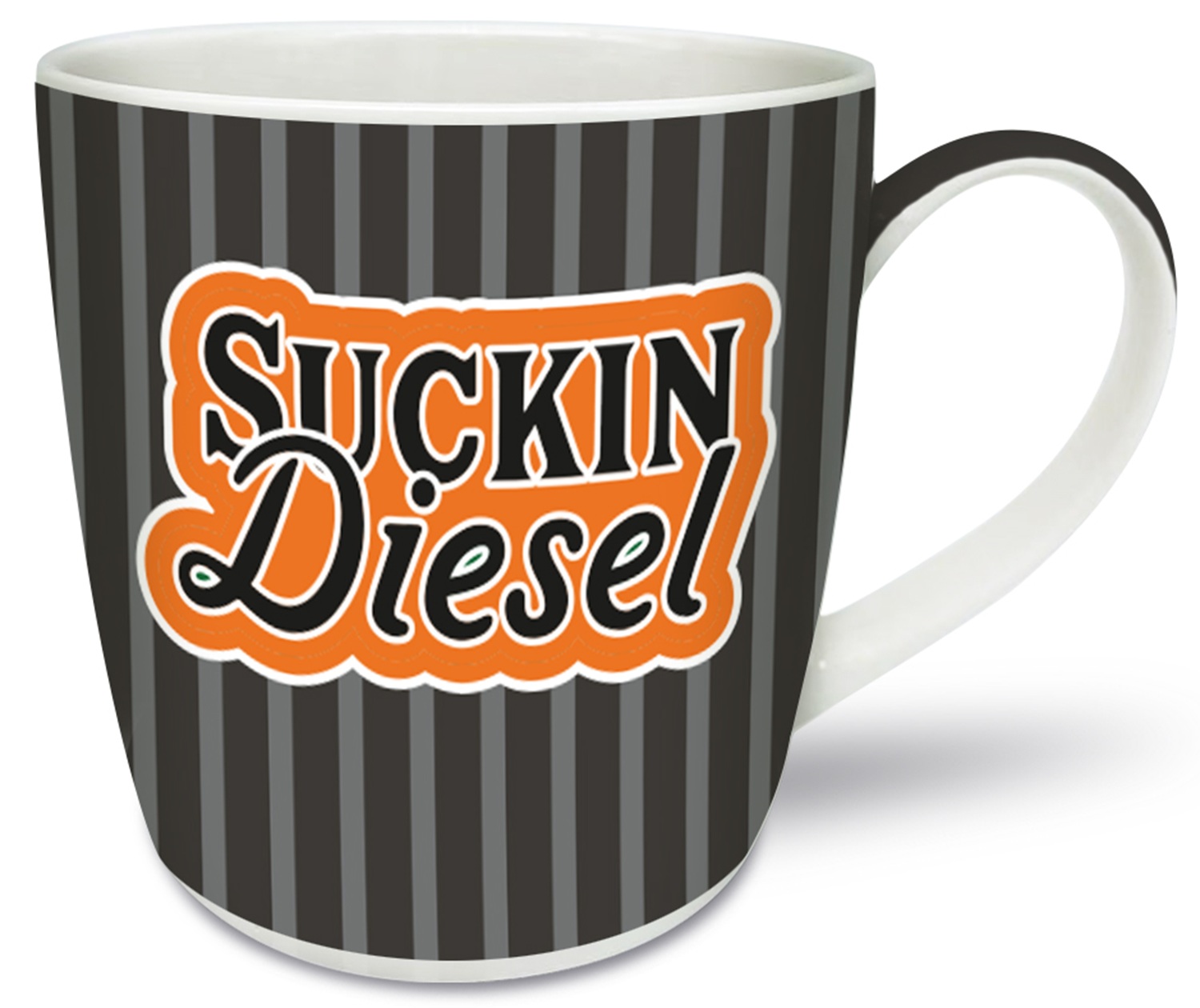 A standard-size ceramic mug, supplied with a gift box, reads, 'Suckin Diesel.'