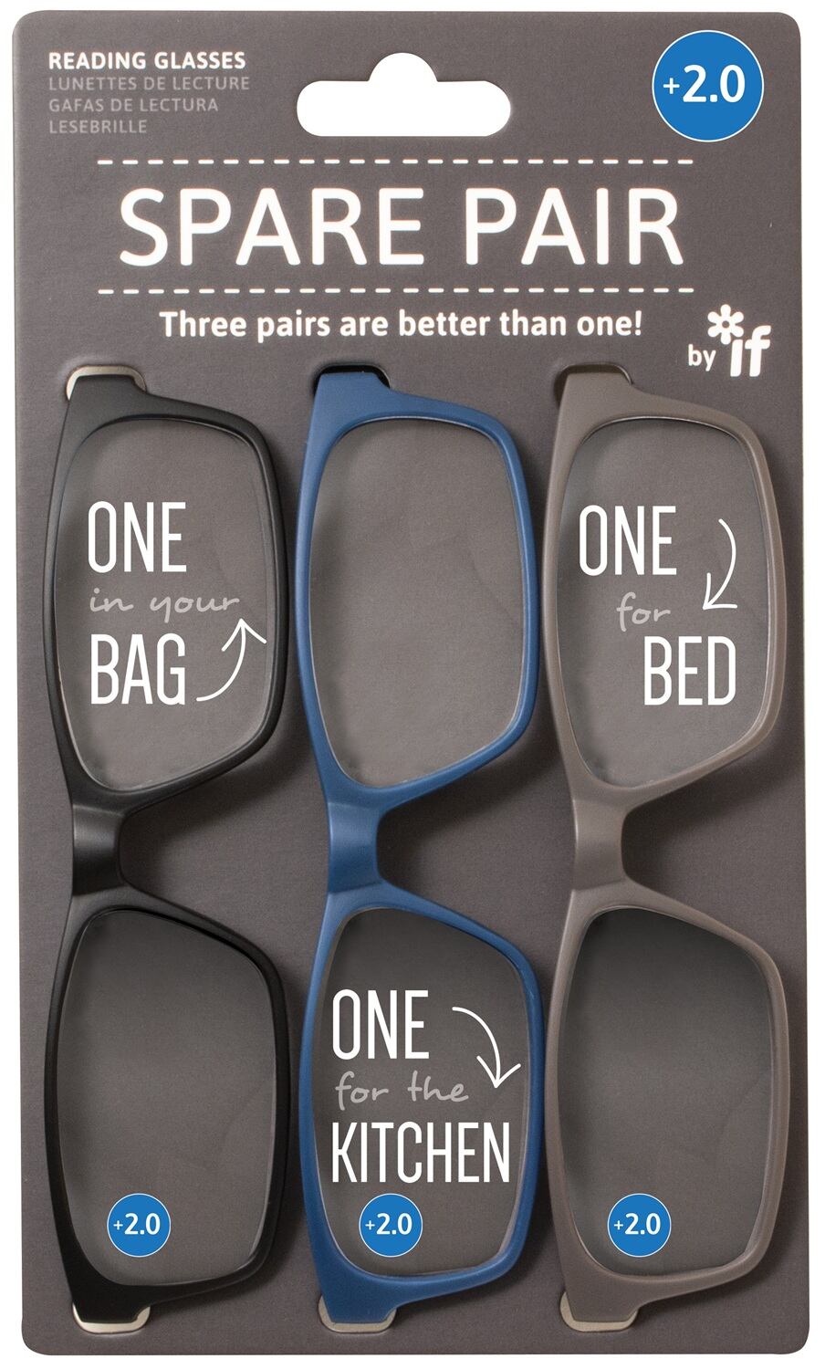 - This really does exactly what it says on the tin… a set of three pairs of reading glasses (all the same strength) to keep in three of the places where you might need glasses… in the kitchen, garage, handbag, the office, in the car, the bedroom… or somewhere slightly more obscure. If you need reading glasses, or know someone who can’t live without them, you’ll need Spare Pair!
