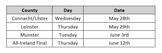 See the full schedule below. Please make note of the Provisional and All-Ireland finals, in case you are lucky enough to be able to attend!