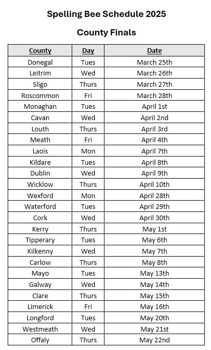 Each registered school will hold their own in-house spelling bee to determine which of their students will be put forward for the Eason Spelling Bee county final. These will run across every county in the Republic of Ireland. Once each county champion has been chosen, the winners will move on to the Provincial Finals, where the top spellers from every county will battle it out to be their province’s champion, and move forward to the All-Ireland Final where we will crown our Eason Spelling Bee winner for 2025.