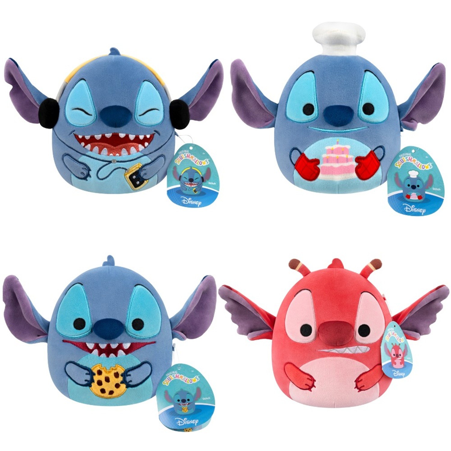 - Celebrate the story of Disney's ""Lilo and Stitch"" with these 8-inch Stitch Squishmallows plush. Squishmallows are made with ultrasoft, high-quality materials and make the perfect cuddly companion for long flights, comfy nights - even Disney movie marathons! Add either Stitch in Headphones, Chef Stitch with Cake, Stitch with Chocolate Chip Cookie, or Leroy to your Squad. Only by Original Squishmallows. Join the Squad! •Includes (1) Original Squishmallows Stitch 8-inch Plush. •There are several styles available within this assortment and unfortunately, it is not possible to request which one you would prefer.