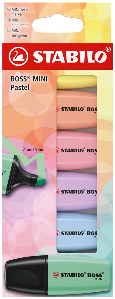 A mini version of STABILO BOSS ORIGINAL in 6 pretty pastel shades. A pocket sized Mini STABILO BOSS in 6 delicate shades designed to create a modern and fresh look when highlighting, shading and colouring. The robust wedge tip enables broad area highlighting (5mm) as well as fine underlining (2mm).
