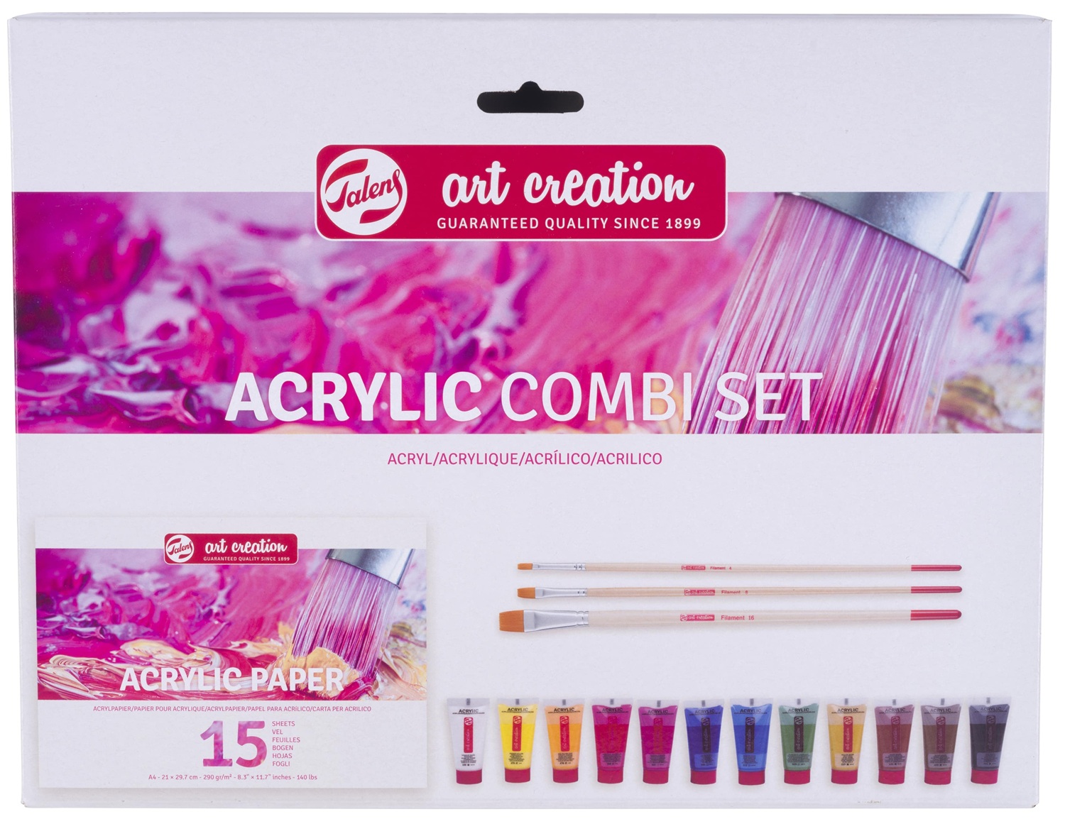 This combination set is the ultimate starter set for those looking to begin their acrylic painting journey! The set contains everything you need to get started: an acrylic colour set of 12 x 12 ml tubes in basic colours to build your palette with, 15 sheets of A4 acrylic colour paper and 3 acrylic painting brushes.It also includes a QR-code to multiple DIY’s so you can easily create your own masterpiece. Taking up painting as a hobby has never been this easy!