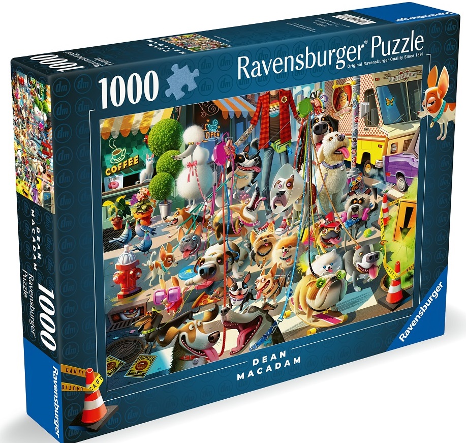 Doggone it, that’s one ambitious dude, with 23 woofers to walk! That hoard of hounds includes a mix of mutts and breeds from a tiny Yorkshire Terrier to a huge Saint Bernard. Fifi the Poodle is not pleased to be hitting the mean streets of the city, and poor Duke is mortified to be seen in public wearing a cone of shame! “The Dog Walker” includes all the quirky fun you’ve come to enjoy in Dean MacAdam’s puzzles — he’s even added some Ravensburger Easter eggs for added entertainment — enjoy!
