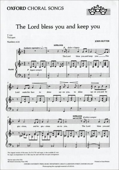 - There are two versions of this anthem - for SATB with organ or strings, or SA with piano The words are from Numbers 6:24.