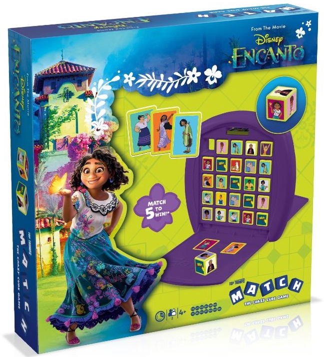 Become enchanted by Encanto once again with this brand new edition of Top Trumps Match: The Crazy Cube Game. Discover all your favourite Madrigal family characters from the hit animated musical movie, like Mirabel, Isabela, Antonio or Bruno. Be the first to line up five of your favourite character to win. Match your mini Top Trumps card for double points, but watch out — if your opponent's card matches your row, they snatch the match! Will you be the first to match Felix, Julieta, Pepa, the toucan or the capybara? With fifteen characters to choose from, it's up to you to decide how to win. The stunning purple game grid doubles as a portable carry case, so you can take your game on the road and play wherever your adventures take you — whether that's a secret cave, or the walls of your own Casita! Are you ready to show off your very own gift and win Top Trumps Match?