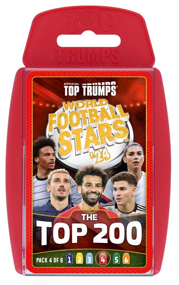 Start collecting all of the world's top players with Top Trumps World Football Stars Top 200. All the best players from the top leagues around the world – UK, France, Italy, USA, Germany, Spain, Middle East – both men and women, are all included. There are six packs to collect, and this is the fourth one. Find out who has more international caps out of Salah and Mahrez, and who's more valuable: Dias or Núñez? Compare stats, learn facts and battle it out to find out who is the Top Trump!