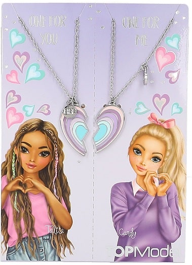 The BFF necklaces from TOPModel each have a half heart as a pendant, which fit together perfectly. 2 designs: silver necklaces with hearts in lilac and turquoise and gold necklaces with hearts in pink and orange. Both with an additional small statement pendant (BFF).