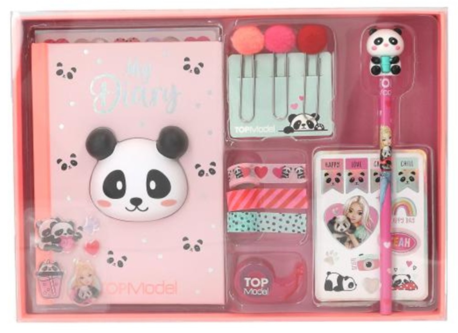 - Panda power! This cute diary is just waiting to be filled with secret thoughts and dreams. Included: 4 rolls of decorative tape with dispenser, 3 large paper clips with coloured pompoms, 1 pink pencil with panda topper and lots of stickers to decorate the pages. The panda head on the cover is a real eye-catcher and guardian of the diary. A small booklet is included for illustrative design ideas.
