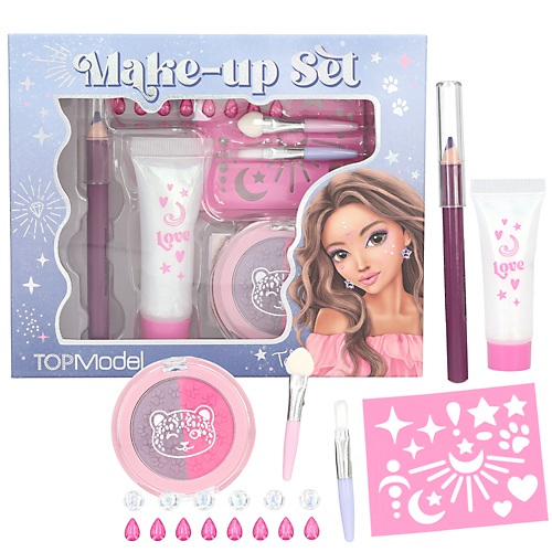 - The TOPModel make-up set with magical glittering stars, moons and cute animal paws contains 1 purple make-up pencil (0.9 g), 1 silver-white body glitter gel (12 ml), purple and pink make-up in a small jar (2.4 g), 14 pretty decorative stones as stickers to stick on the skin and 2 brushes.