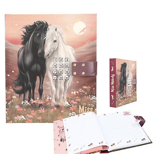 - For secret thoughts and dreams: Miss Melody's diary in soft shades of pink and red has a dreamlike motif on the cover featuring two horses in a flower meadow at sunset. The inside of the diary is also lovingly illustrated and has 80 finely lined pages. The diary's lock only opens when the correct four-digit code (which can be set and changed by the owner) is entered. Then Taylor Swift's hit song Wildest Dreams plays for about 20 seconds.