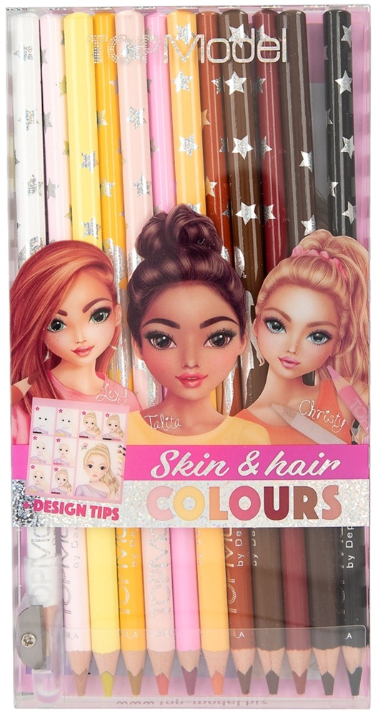 All colours for hair and skin: The colouring pen set from TOPModel consists of 12 different coloured crayons. Included in the set: white, complexion, light yellow, gold, powder, rosé, apricot, caramel, nougat, cocoa, mahogany and black. For great results when painting hair and skin.