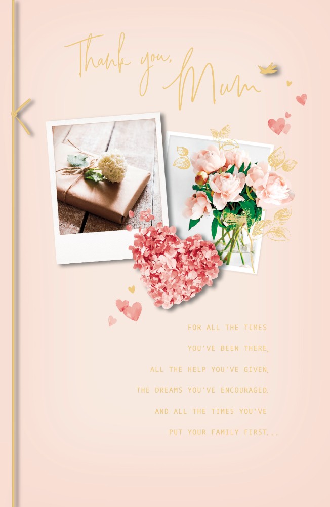 Thank Mum for all the times she’s been there with this heartfelt Mother’s Day card. Featuring an extended message, it’s accented with embossed gold foil details and finished with raised 3D elements, a little bird charm and a wraparound cord.
