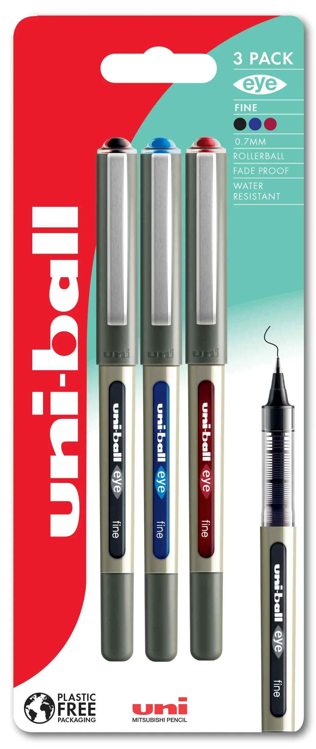Uniball 157 3 piece blister pack in black, blue and red.