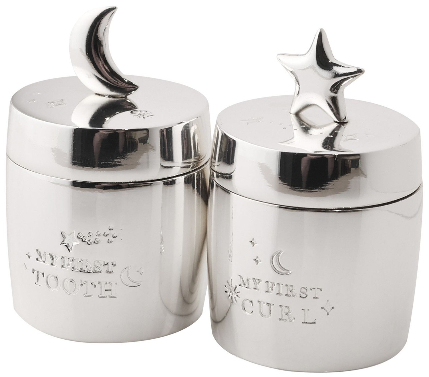 Introducing the Bambino Silver-Plated Barrel-Shaped Tooth & Curl Keepsake Boxes -Star & Moon Design by Juliana® – a charming and elegant addition to a child’s nursery.