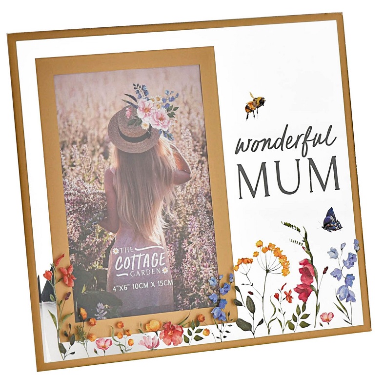A glass frame from The Cottage Garden by CELEBRATIONS®.This magnificently presented frame is covered in unique touches which are sure to bring a smile to the face of a much-loved mother.The glass, freestanding frame features beautifully painted wildflowers around its portrait aperture, complete with ‘Wonderful Mum’ decal. It is finished with complementary gold coloured edging around both the outer frame and aperture.