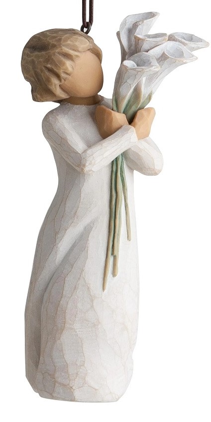 Willow Tree is an intimate line of figurative sculptures representing sentiments of love, closeness, healing, courage, hope...all the emotions we encounter in life. Susan Lordi's classic figurative ornaments are smaller-size versions of her most popular pieces redesigned as hanging ornaments with stretchy cord. The item is made in resin and hand-painted with lead-free paint. Supplied in a branded gift box and a gift tag with the sentiment 'A gathering of beautiful wishes for you - love, health, happiness'. Not a toy or children's product. Intended for adults only.