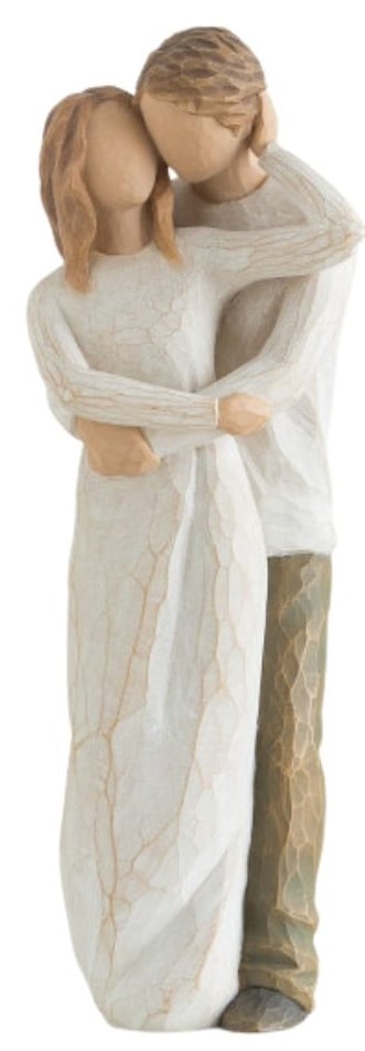 Figure of couple, standing with arms around each other. Woman in cream dress, with lighter skin tone and hair color, man in cream shirt and dark pants with lighter skin tone and hair color
