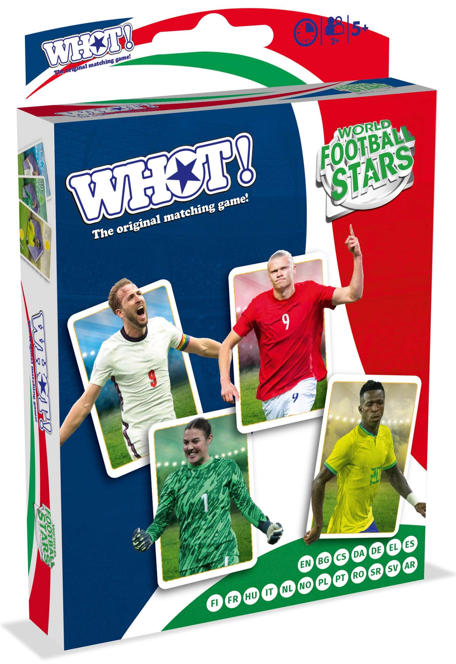- Pick up this fantastic new World Football Stars edition of WHOT!, the classic matching game. WHOT! contains 53 playable cards featuring some of the best players in the world, including Harry Kane, Erling Haaland and Mary Earps, which you must match using the images, icons or numbers. WHOT! is a fast-moving classic card game that's been around for generations, and now a new wave of Football lovers can enjoy it as well. Be the first to empty your hand by playing all of your cards, and deploy the special WHOT! cards to bend the rules to your advantage. With great action shot photos and dynamic artwork and recognisable players, WHOT! is ideal for young children to learn shapes, colours and numbers, although we certainly won't blame any grown-up players who want to play as well. World Football Stars is endlessly entertaining and can be enjoyed by all, in this wonderful new edition of WHOT! -Requires 2 or more players. - Age Rating: 5+