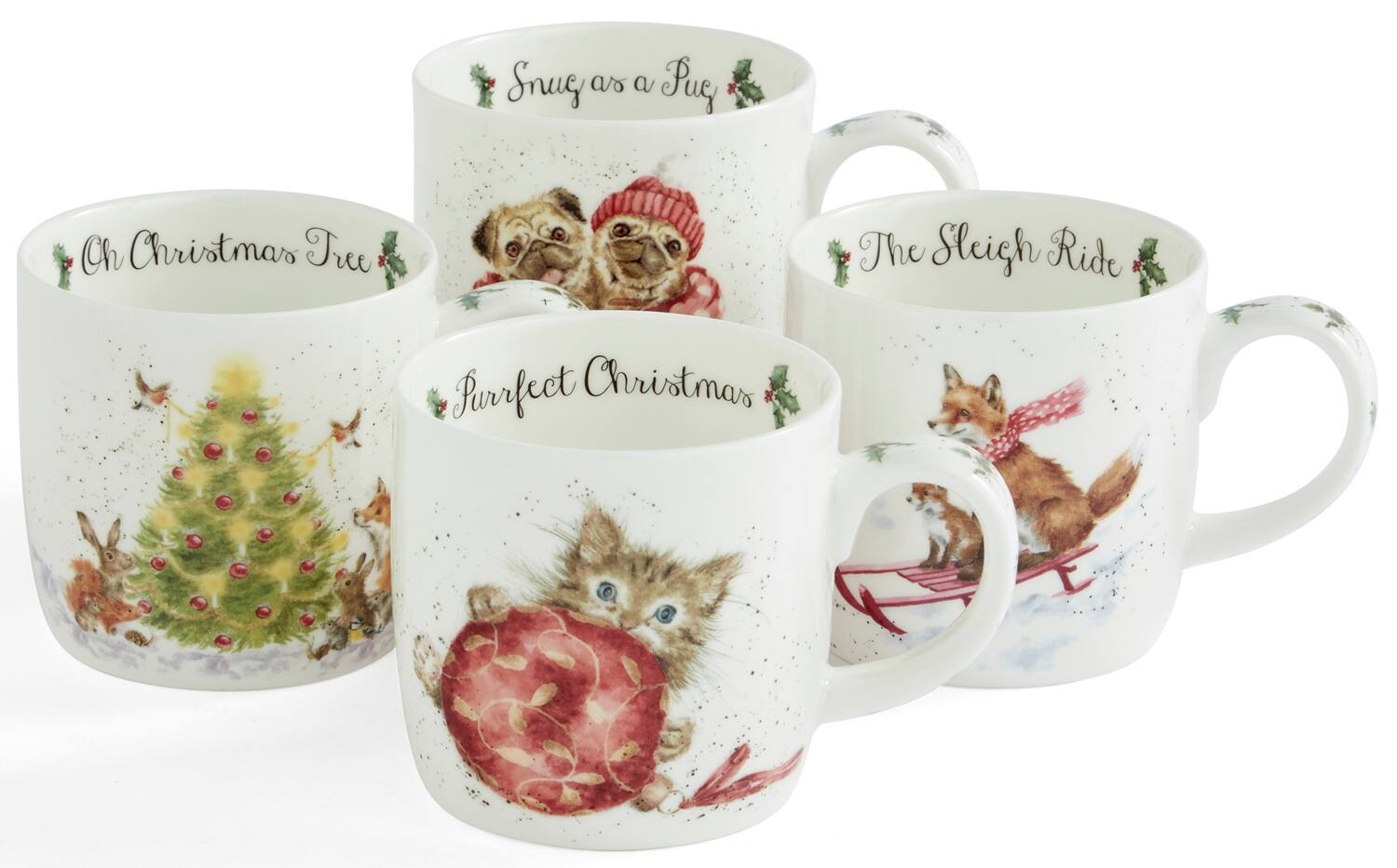- Bring a touch of festive charm to your cuppa with this delightful Wrendale Christmas Mug Set by Royal Worcester. Featuring four enchanting winter animal scenes illustrated by Hannah Dale, each mug has its own cheerful design: a kitten tangled in ribbon with “Purrfect Christmas”, snug pugs wrapped in scarves with “Snug as a Pug”, playful foxes sledding in “The Sleigh Ride”, and woodland creatures gathered around a tree with “Oh Christmas Tree”. Presented in a vibrant red gift box, this set of 4 fine china mugs is perfect for adding a cosy, whimsical feel to your Christmas mornings.