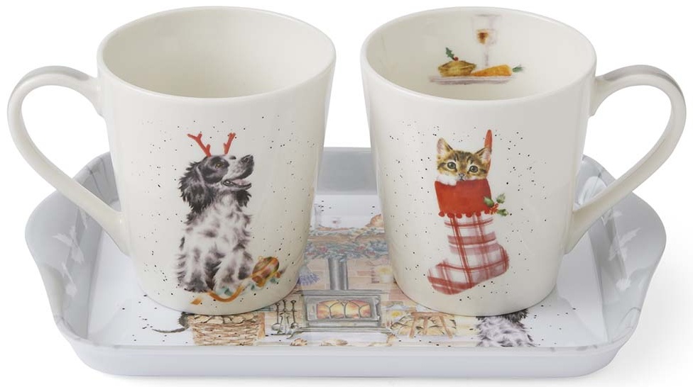 The melamine tray features a festive fireplace scene and each mugs is adorned with a cat and dog.